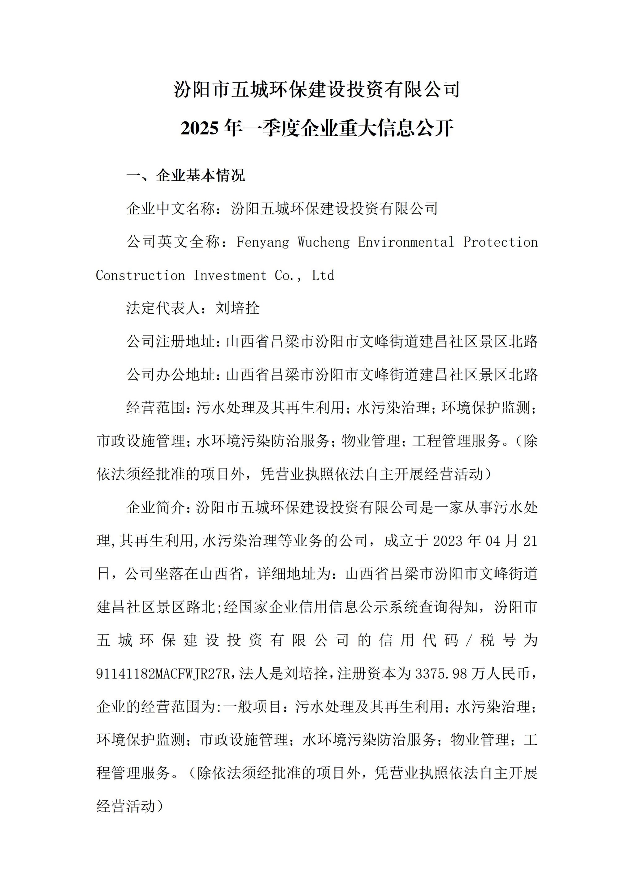汾阳五城环保建设投资有限公司2025年一季度企业重大信息果真