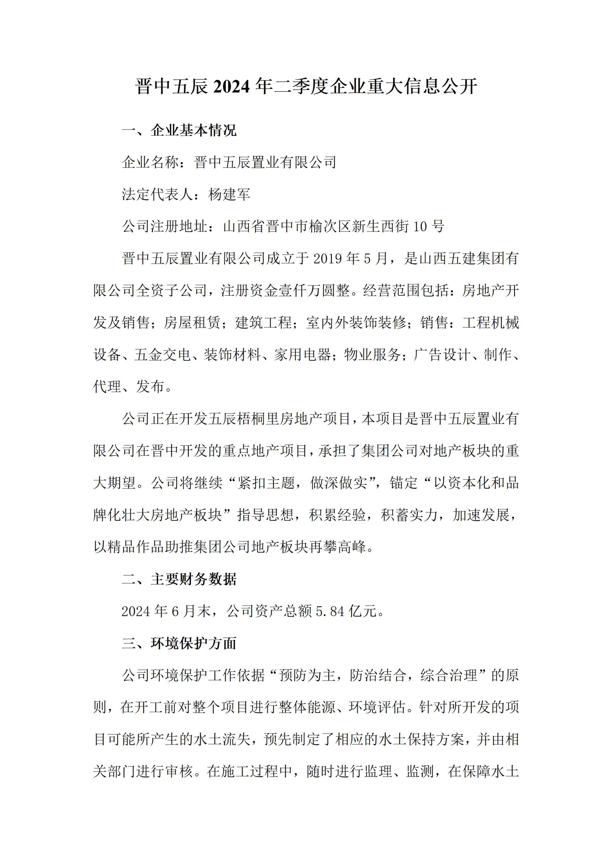 晋中五辰置业有限公司2024年二季度企业重大信息果真