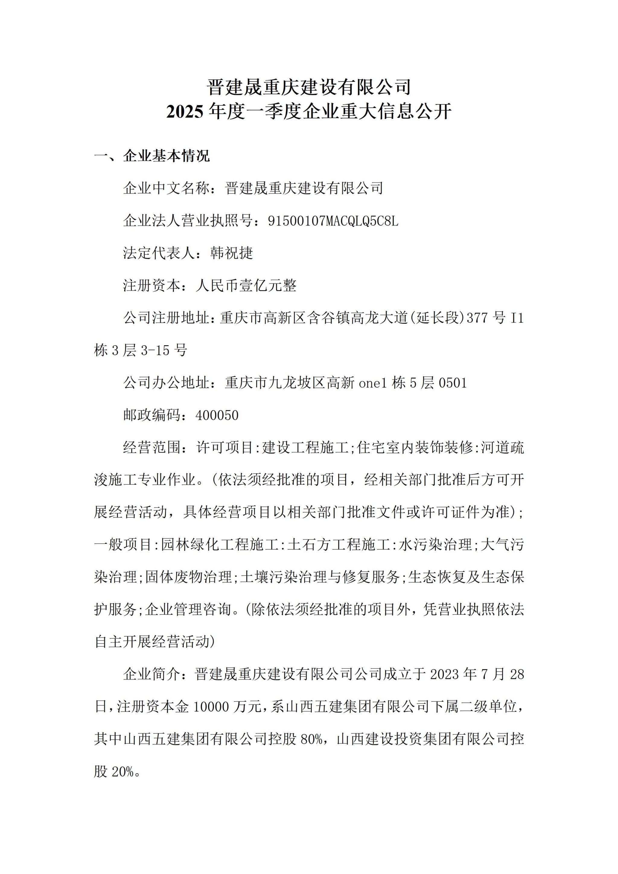 晋建晟重庆建设有限公司2025年一季度企业重大信息果真