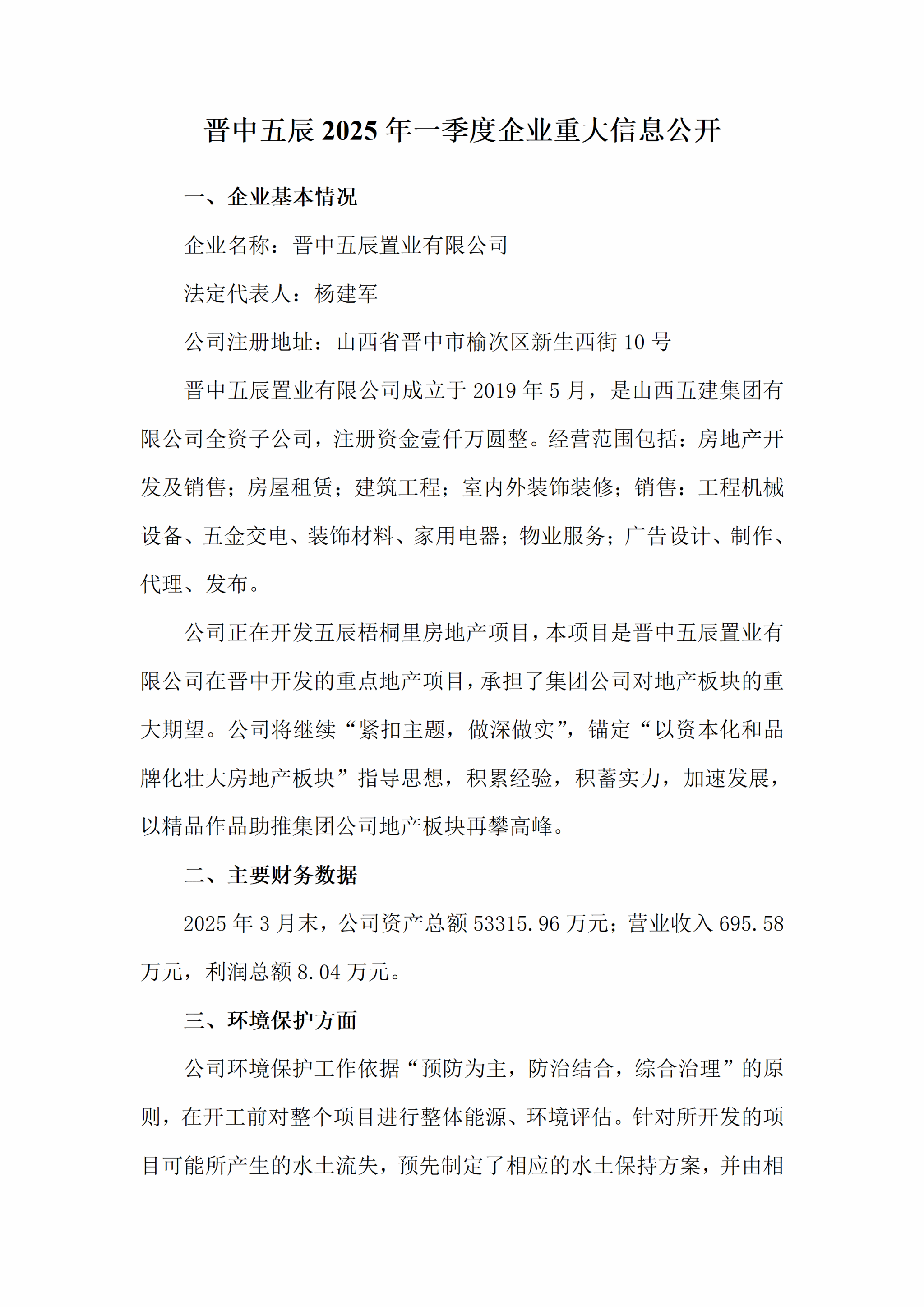 晋中五辰置业有限公司2025年一季度企业重大信息果真