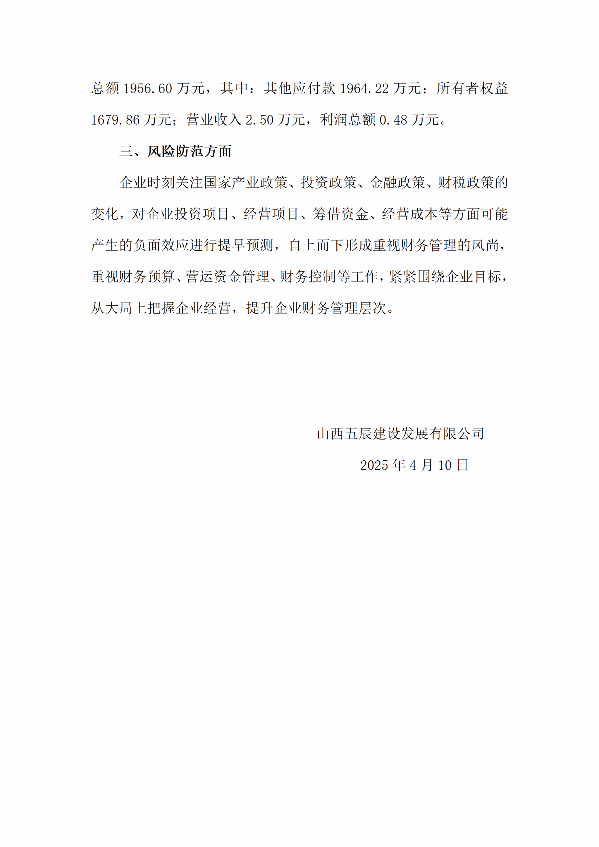 山西五辰建设生长有限公司2025年一季度企业重大信息果真