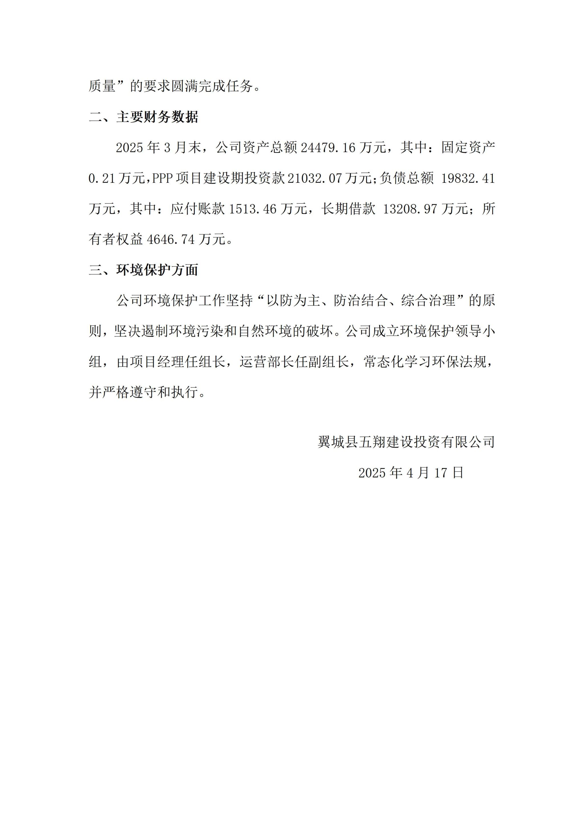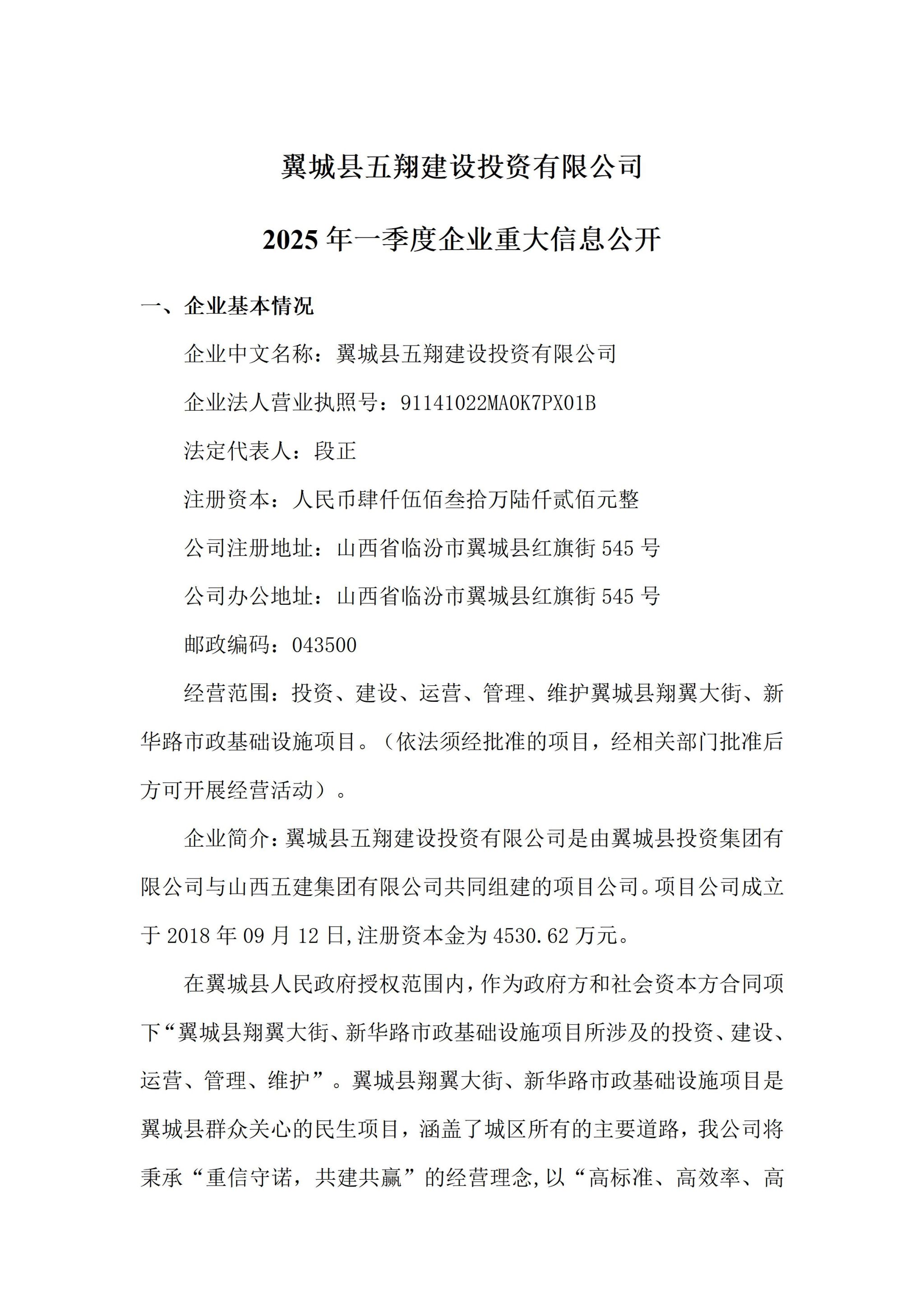 翼城县五翔建设投资有限公司2025年一季度企业重大信息果真