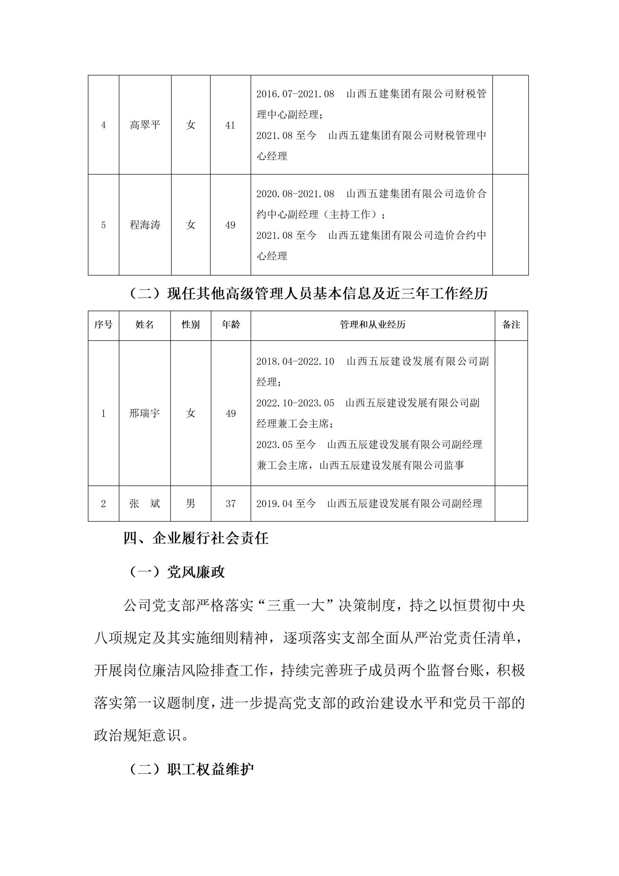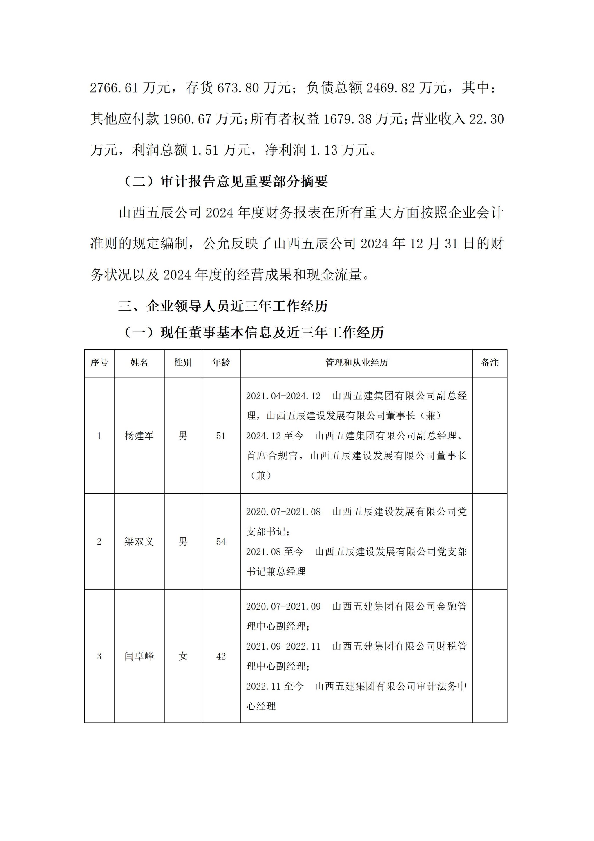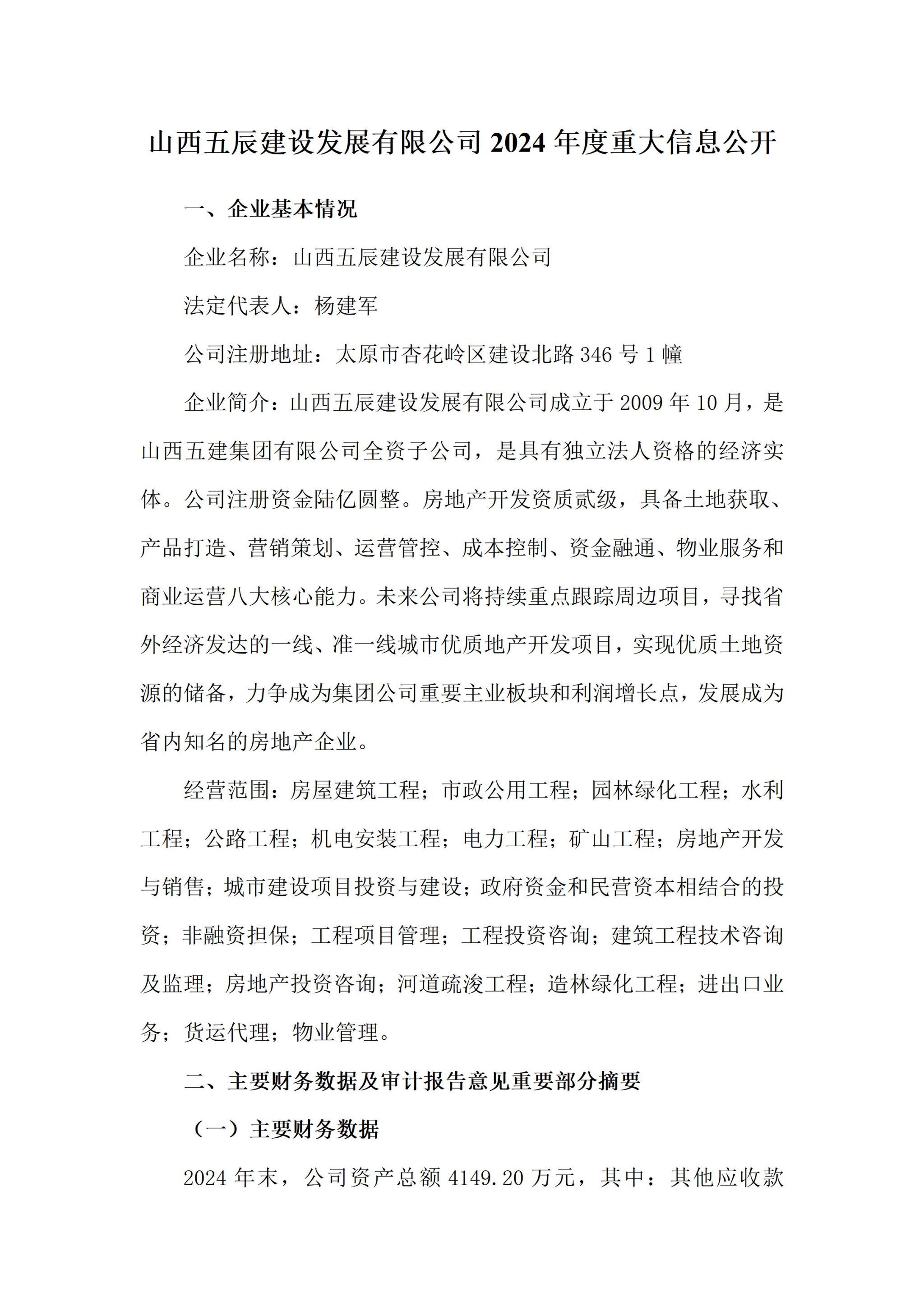山西五辰建设生长有限公司2024年度企业重大信息果真
