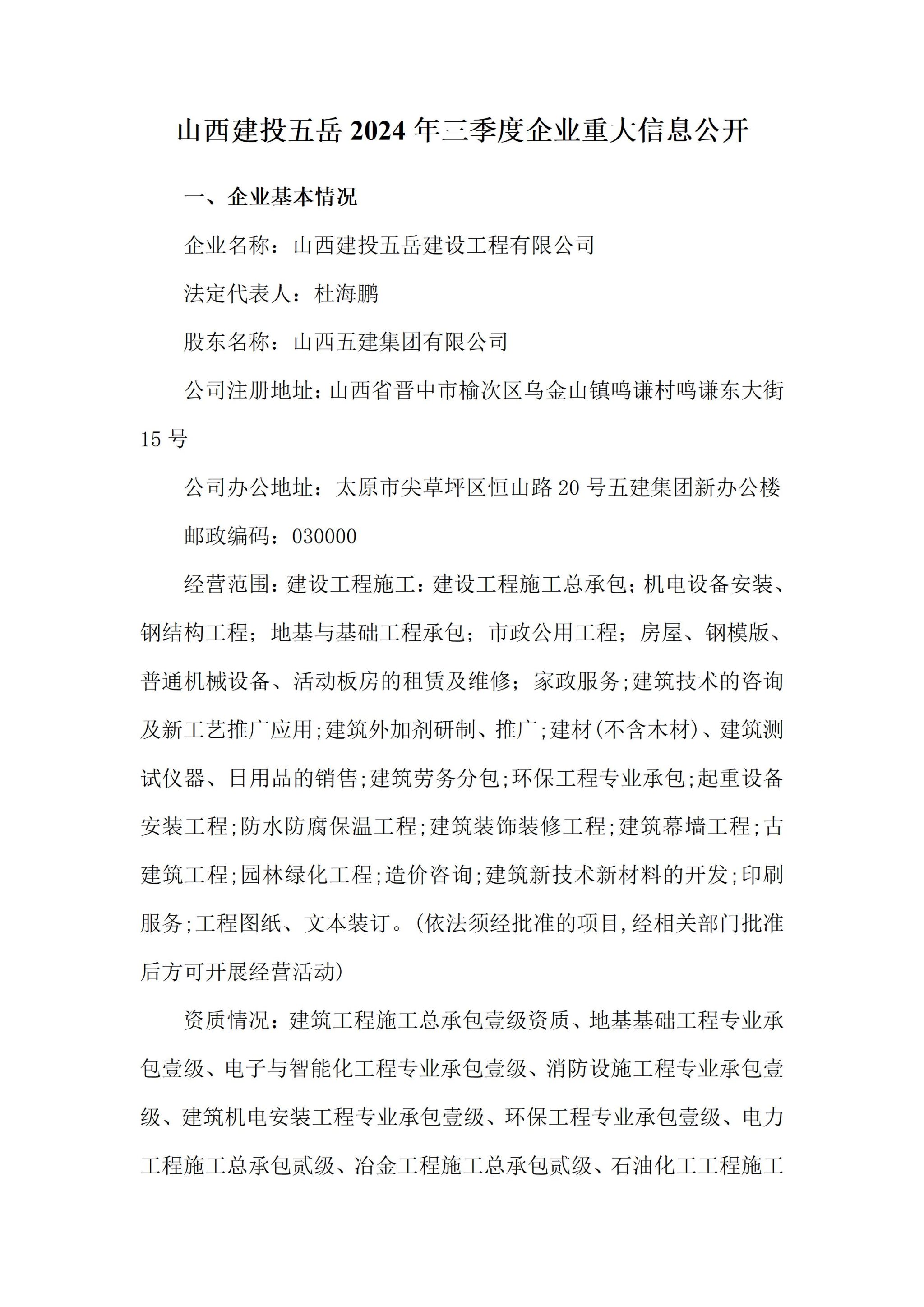 山西建投五岳建设工程有限公司2024年三季度企业重大信息果真